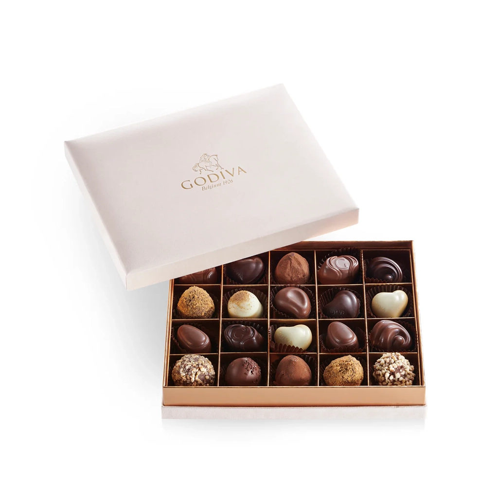 An elegant chocolate gift box with 20 gourmet GODIVA pieces – the ultimate indulgent treat.